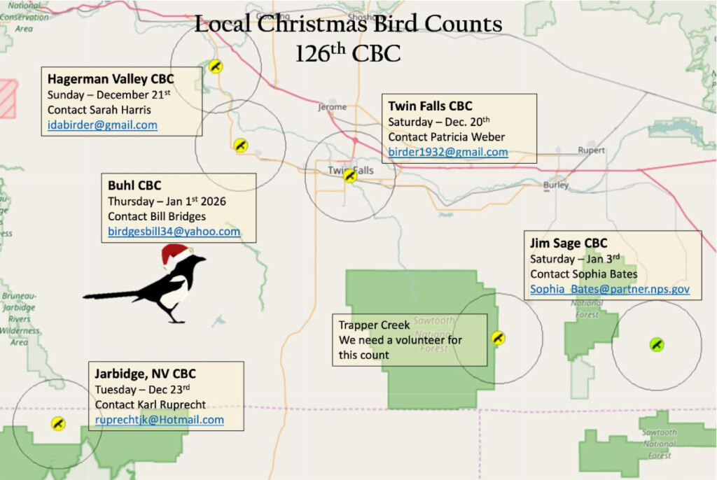 Registration is open for the 126th year of the National Audubon Society Christmas Bird Count. It’s the world’s longest-running community science project. Prairie Falcon Audubon organizes five counts in the Magic Valley area. Each occurs during the three weeks between Dec 14th and Jan 5th. There are two different ways you can participate and help collect valuable scientific data.